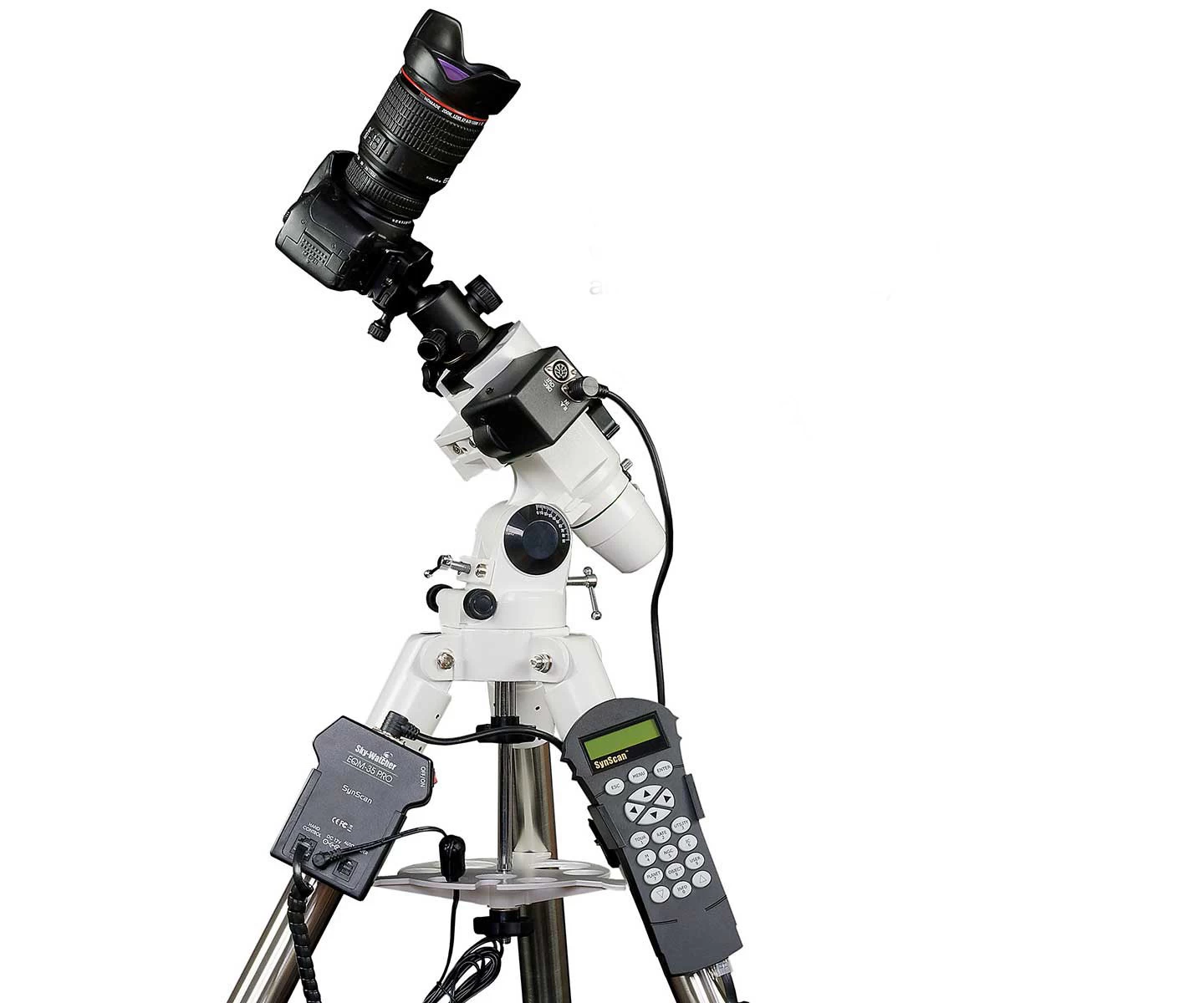 SkyWatcher EQM-35 Pro Goto mechanika sokaknak ismerős lehet akiknek volt vagy van EQ-3-as mechanikája. Pedig ez a modell sokkal több mint elsőre gondolnánk. A mechanikafej az HEQ-5-nél megismert igen stabil acéllábakon nyugszik, a fej pedig tartogat némi meglepetést, azon túl, hogy teljes értékű GOTO funkcióval rendelkezik, még könnyen hordozható asztrofotós mechanikaként is bevethető. Beépített pólustávcsöve segít a pontos pólusra állásban. A fejére bármely Vixen-szabványú prizmasínes távcső felhelyezhető, egészen 10 kg-os tömegig. Áttervezett, megnövelt átmérőjű csigahajtómű kereke minimalizálja periodikus hibák mértékét.